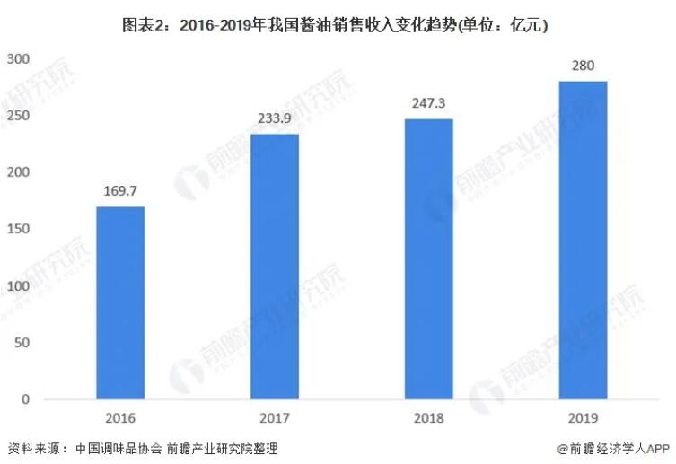 根據(jù)中國調(diào)味品協(xié)會(huì)數(shù)據(jù)顯示,2016-2019年我國調(diào)味品百強(qiáng)企業(yè)中,醬油行業(yè)銷售收入呈逐年上升趨勢(shì),2019年其銷售收入達(dá)到280億元,較2018年同比增長(zhǎng)13.22%,占調(diào)味品行業(yè)總銷售收入比重為27%。
