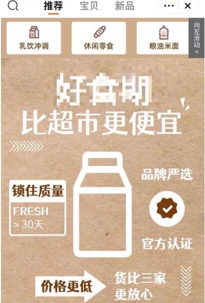 小編在淘寶APP上嘗試購買臨期產(chǎn)品,在某店鋪首頁有海報(bào)大字宣傳:“比超市更便宜!