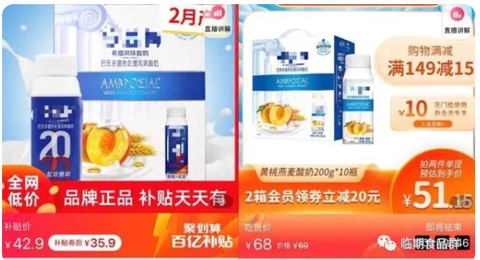 以某品牌酸奶為例,該臨期店鋪的優(yōu)惠到手價(jià)格為35.9元,生產(chǎn)日期為2月;品牌旗艦店商品海報(bào)上的參考優(yōu)惠到手價(jià)格為51.15元,生產(chǎn)日期注明為4月。