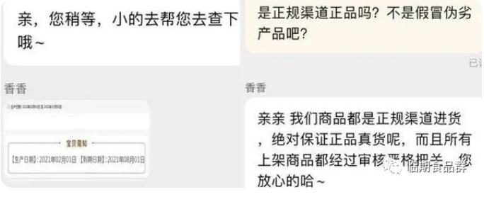 小編隨后聯(lián)系了人工客服,對(duì)商品保質(zhì)期、食用安全、商品真?zhèn)芜M(jìn)行了問詢。商家表示,產(chǎn)品均為正規(guī)渠道產(chǎn)品,且在保質(zhì)期內(nèi)。