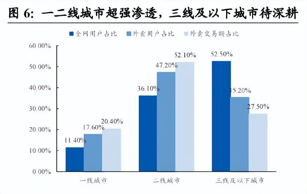 據(jù) Trust data 數(shù)據(jù)顯示,一二線城市外賣交易額占比超70%,外賣用戶數(shù)量占比超60%,與互聯(lián)網(wǎng)用戶相比,一二線城市超強滲透。三線及以下城市在外賣滲透率以及客單價方面仍有較大提升空間,據(jù)阿里本地生活數(shù)據(jù),低線城市用戶數(shù)量的增長速度明顯高于高線城市。