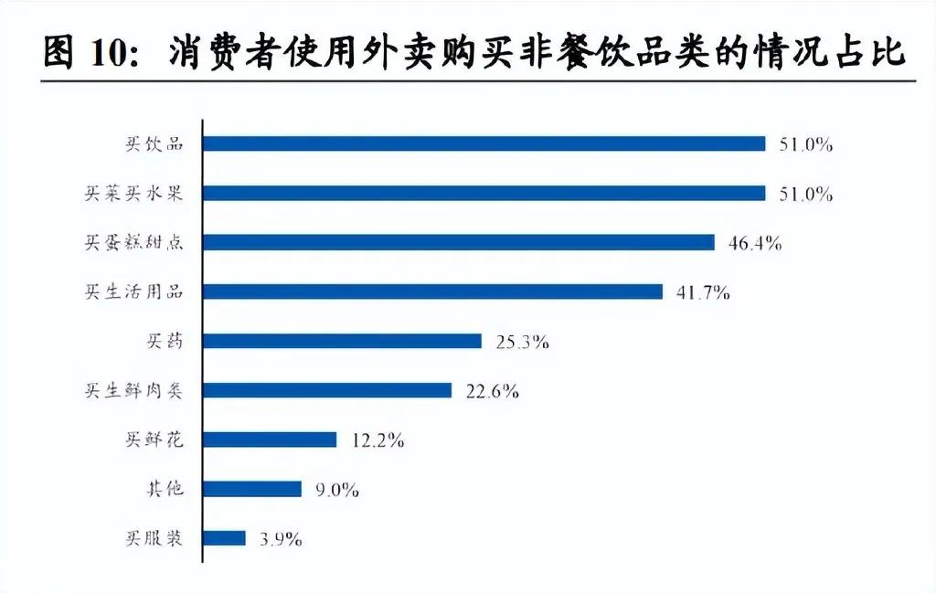 外賣已進入跨行業(yè)、跨場景、跨品類發(fā)展的新業(yè)態(tài),開啟萬物到家時代。外賣經歷飛速發(fā)展后,其商業(yè)模式已經得到市場驗證,隨著外賣在供給側和需求側的深度滲透,加之配送效能的提升,覆蓋邊界也從餐飲擴張至新零售。DCCI外賣服務白領市場價值研究報告》顯示,接近 90%的用戶已經將外賣平臺作為全品類消費平臺。雖然目前外賣平臺的品類仍以餐飲為主,占比約 97%,但是甜點飲品、生活超市、生鮮果蔬、鮮花綠植等非餐的訂單量和配送需求正在快速增長。同時,消費者用餐場景愈加豐富,非常規(guī)用餐高峰如早餐、下午茶、夜宵呈現(xiàn)增長趨勢。多場景、多品類、多時段等消費習慣逐步養(yǎng)成,進一步提高消費者對外賣的粘性,從而提高消費頻次。