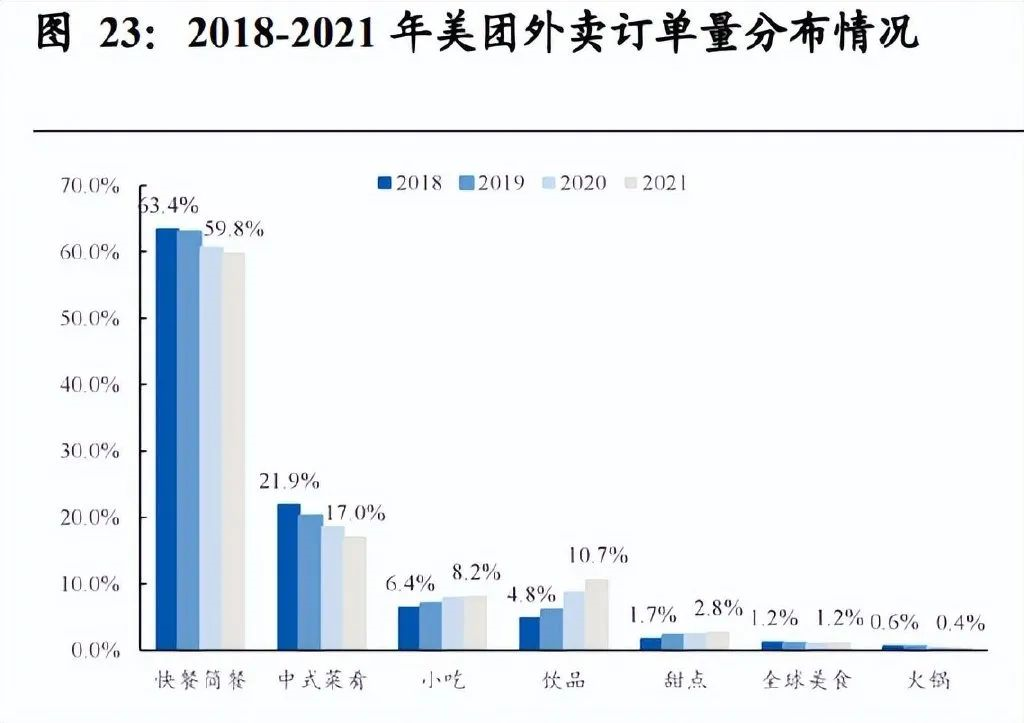 品類結構概況:剛需快餐占據(jù)半壁江山,飲品、甜點等非剛需品類年復合增長率超過剛需快餐。小吃快餐剛需、高頻、投資門檻低等特點,決定其是餐飲外賣第一大品類。據(jù)美團外賣數(shù)據(jù),線下小吃快餐類堂食門店數(shù)占美團收錄餐飲門店數(shù)的46.8%,線上快餐簡餐品類貢獻 60%左右外賣訂單量,50%+外賣交易額。飲品、甜點年復合增長率超過快餐簡餐、中式菜肴等品類,成為外賣訂單量增長的主要驅動力。其中,奶茶作為頭部品類持續(xù)高速增長,2019-2021 年復合增長率 69.6%,遠超其它細分品類。2021 年,奶茶超越飯類套餐和漢堡,成為訂單量占比第一的細分品類。