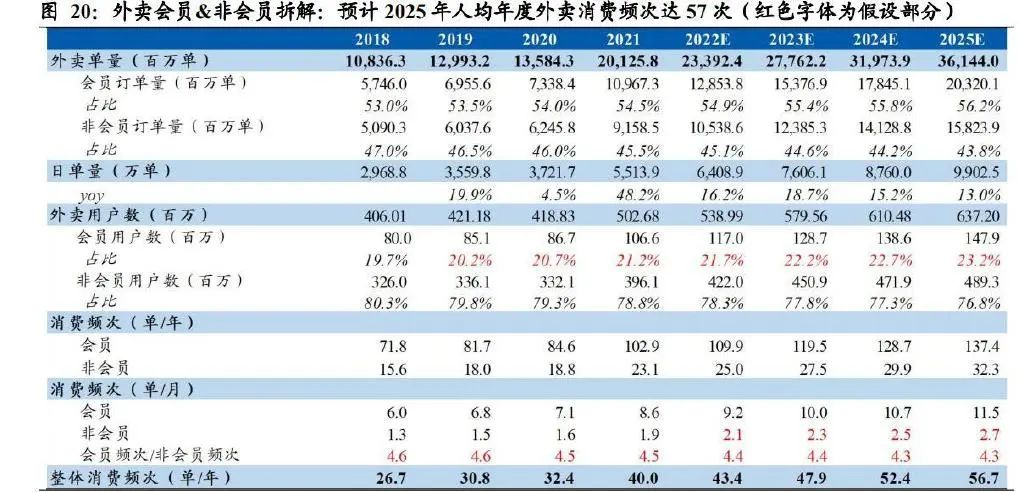 測算方法:拆解用戶結構,預計 2025 年我國人均年度外賣消費頻次達 57 次左右。外賣會員&非會員拆解核心假設:1)據(jù) CNNIC 以及艾媒咨詢數(shù)據(jù),2018 年我國外賣用戶數(shù)量為 4.06 億人,外賣會員數(shù)量 8,000 萬人,占比約 20%,假設后續(xù)會員數(shù)量占比保持在 20%左右并逐年小幅增長;2)據(jù)餓了么以及美團數(shù)據(jù),餓了么超級會員人均下單頻次是非會員的2.3 倍,美團會員消費頻次是平均水平的 3 倍(即非會員的 4.6 倍),結合美團與餓了么的市占率規(guī)模,預計會員消費頻次/非會員消費頻次在 4.5 倍左右。同時,2018-2021 年會員消費頻次 CAGR 為 12.7%,非會員消費頻次 CAGR 為 14.0%,外賣非會員頻次增長將高于會員頻次增長,假設后續(xù)會員頻次/非會員頻次維持在 4 倍+的水平并逐年小幅遞減;3)假設 2021-2025E 非會員消費頻次 CAGR 為 8.75%。經測算,預計 2025 年外賣訂單量達 361.4 億單,對應日單量 9,902.5 萬單,消費頻次為 56.7 次/年。外賣會員年消費頻次達 137.4 次/年,用戶占比為 23.2%,訂單量占比為 56.2%。