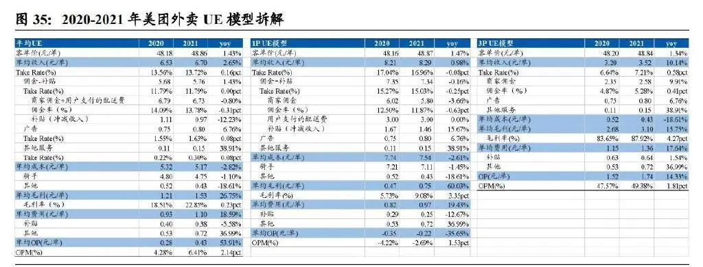 拆分結(jié)果:1)美團(tuán)外賣:2021 年客單價(jià)為 48.86 元,單均收入為 6.70 元,take rate 為 13.72%,單均成本 5.17 元,單均費(fèi)用 1.10 元,單均 OP(Operating Profit)為 0.43 元,OPM(Operating Profit Margin)為 6.41%。2)1P 模式:2021 年單均收入 8.29 元,take rate 為 16.96%,單均成本 7.54 元,單均費(fèi)用 0.97 元,單均 OP 為-0.22 元,OPM 為-2.69%。3)3P 模式:2021 年單均收入 3.52 元,take rate 為 7.21%,單均成本 0.43 元,單均費(fèi)用 1.36 元,單均 OP 為 1.74 元,OPM 為 49.38%。