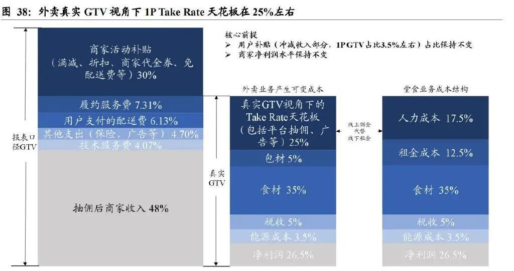 商家活動(dòng)補(bǔ)貼占外賣 GTV 比重 30%,預(yù)計(jì)外賣真實(shí) GTV=70%報(bào)表口徑 GTV。美團(tuán) 3P 模式下傭金收入為技術(shù)服務(wù)費(fèi),費(fèi)率穩(wěn)定,且短期內(nèi)提升的可能性不大,所以我們只討論 1P Take Rate 的空間。我們統(tǒng)計(jì)了 20 余家使用美團(tuán)配送的美團(tuán)外賣商家的經(jīng)營(yíng)數(shù)據(jù)情況,商家各項(xiàng)支出平均占 GTV 比重分別為:活動(dòng)補(bǔ)貼 30%、履約服務(wù)費(fèi) 7.31%、技術(shù)服務(wù)費(fèi) 4.07%、用戶支付的配送費(fèi) 6.13%(預(yù)計(jì)值)、其他支出(如保險(xiǎn)、百萬(wàn)津貼、推廣等)4.70%,收入占 GTV 的比例為 48%。其中,商家活動(dòng)補(bǔ)貼主要是商家參與滿減、商家代金券、免配送費(fèi)等活動(dòng)支出,雖然平臺(tái)、代理商對(duì)這些活動(dòng)均有一定補(bǔ)貼,但主要支出還是由商家承擔(dān),所以商家在設(shè)置餐品價(jià)格時(shí),會(huì)根據(jù)活動(dòng)力度提高餐品價(jià)格,以保證自身的利潤(rùn)水平。同時(shí),外賣平臺(tái)抽傭的計(jì)算基準(zhǔn)同樣也是優(yōu)惠后的價(jià)格,即技術(shù)/履約服務(wù)費(fèi)=(GTV-活動(dòng)補(bǔ)貼+打包費(fèi))×技術(shù)/履約服務(wù)費(fèi)率。為了能夠真實(shí)的反映商家的實(shí)際收入以及實(shí)際抽傭水平,我們將活動(dòng)補(bǔ)貼從 GTV 中剔除,得到外賣真實(shí) GTV 水平,并結(jié)合外賣與堂食的成本結(jié)構(gòu),以商家收入的視角,討論 1P Take Rate 的理論空間。