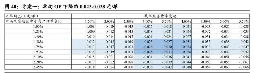 核心假設(shè):1)非疫情中高風(fēng)險(xiǎn)地區(qū)的困難中小商戶訂單占比=(1-中高風(fēng)險(xiǎn)地區(qū)訂單占比)×困難中小商戶占比。其中,中高風(fēng)險(xiǎn)地區(qū)訂單占比在 3.00%-7.00%,困難中小商戶占 比 超 11.36%, 故 假 設(shè) 非 疫 情 中 高 風(fēng) 險(xiǎn) 地 區(qū) 的 困 難 中 小 商 戶 訂 單 占比在9.50%-13.50%。2)當(dāng)前不同地區(qū)、不同配送方式的技術(shù)服務(wù)費(fèi)在 5.8%-7.5%的水平,保守估計(jì)取封頂值 5%,則技術(shù)服務(wù)費(fèi)率變動(dòng)在 0.8pct-2.5pct,假設(shè)費(fèi)率變動(dòng) 0.50pct-2.85pct。測(cè)算結(jié)果:取中性假設(shè),當(dāng)非中高風(fēng)險(xiǎn)地區(qū)困難商戶訂單占比在 11.00%-12.00%、技術(shù)服務(wù)費(fèi)率變動(dòng) 1.35pct-1.95pct 時(shí),單均 OP 下降約 0.073-0.114 元/單,OPM下降約 1.024pct-1.624pct,外賣貨幣化率下降約 0.149pct-0.234pct。