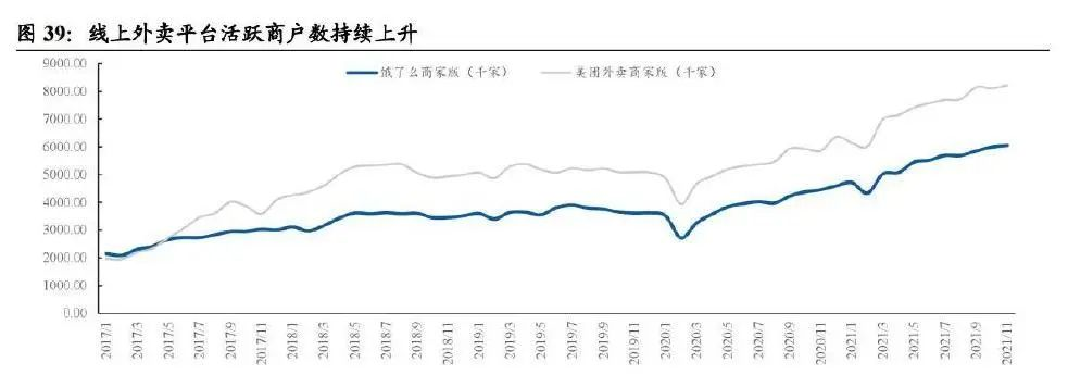 2021年美團(tuán)外賣廣告營(yíng)銷實(shí)現(xiàn)營(yíng)收114.35億元,收入占比11.87%,貨幣化率為1.63%。我們認(rèn)為,未來(lái)外賣平臺(tái)的廣告貨幣化率有望進(jìn)一步提升,主要基于以下幾點(diǎn):1)線上外賣平臺(tái)活躍商戶數(shù)持續(xù)上升。自 2020 年疫情爆發(fā)以來(lái),餐飲行業(yè)總體收入走低,但與此同時(shí),商鋪?zhàn)饨鹨廊痪S持在高位。據(jù)中國(guó)飯店協(xié)會(huì)的調(diào)研報(bào)告,77.5% 的餐飲商戶表示在門店租金上存在經(jīng)營(yíng)壓力。而外賣業(yè)務(wù)能夠提升坪效,其剛性成本如房租和人力支出等成本可得到壓縮,越來(lái)越多的商家開(kāi)始布局外賣業(yè)務(wù)。Quest Mobile 數(shù)據(jù)顯示,2021 年 11 月,外賣平臺(tái)商家版月均 MAU 達(dá)近一年來(lái)的峰值。