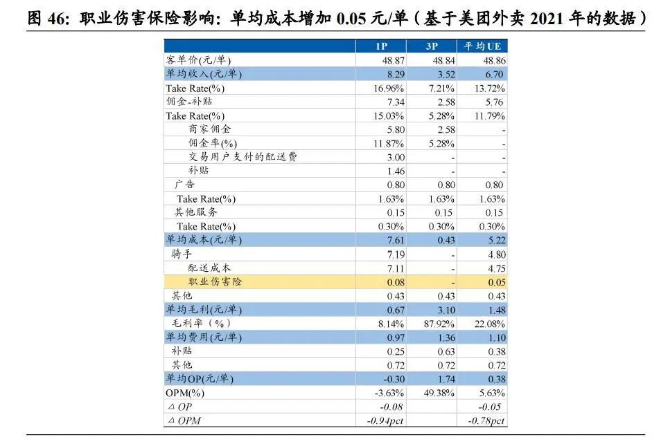 測(cè)算結(jié)果(基于 2021 年的數(shù)據(jù)進(jìn)行測(cè)算):1)2021 年美團(tuán)餐飲外賣配送相關(guān)成本為 682 億元,則美團(tuán)需為騎手繳納職業(yè)傷害保險(xiǎn)的費(fèi)用為 682 億元×1.10%=7.50 億元。2)1P 單均職業(yè)傷害保險(xiǎn)成本為 0.08 元,OPM 下降 0.94pct 至-3.63%;3P 為第三方配送,無(wú)影響。3)整體單均職業(yè)傷害保險(xiǎn)成本為 0.05 元,OPM 下降 0.78pct 至 5.63%。