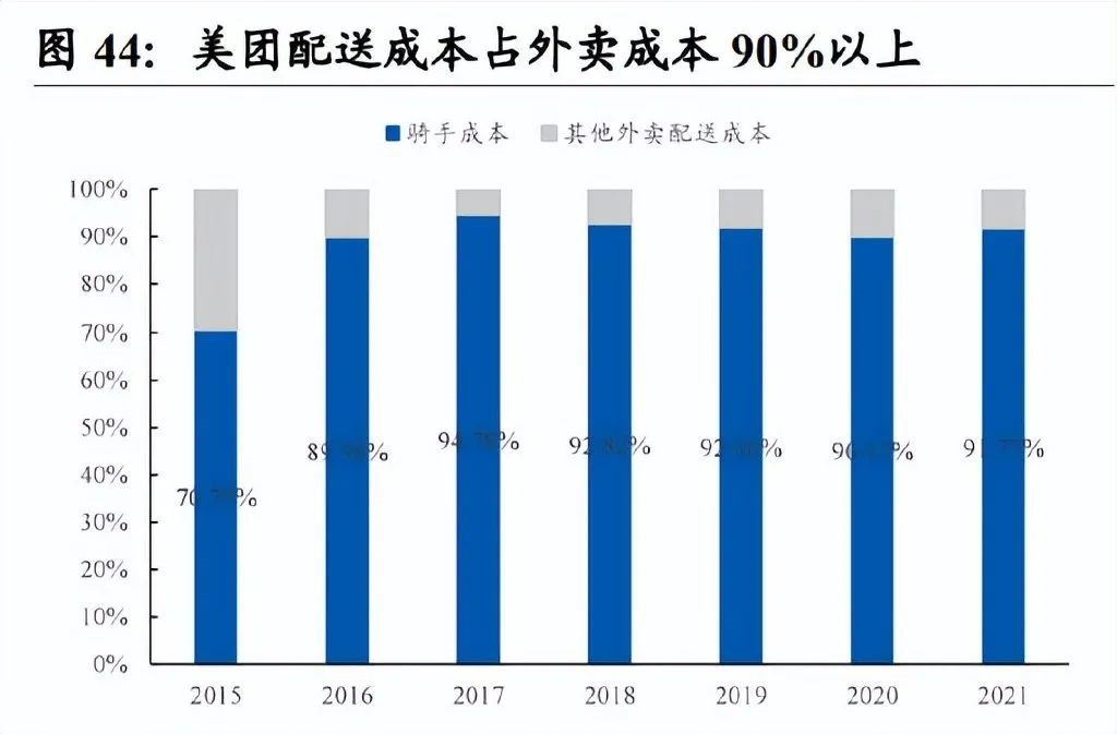 當(dāng)前配送成本保持相對(duì)剛性,我們認(rèn)為主要是運(yùn)力不足&疫情影響下騎手補(bǔ)貼水平提升。據(jù)美團(tuán)數(shù)據(jù),2019-2021 年 1P 交易筆數(shù)由 5,748 萬(wàn)筆增長(zhǎng)至 9,575 萬(wàn)筆,漲幅為 67%,而同期 1P 單均配送成本維持在 7.15 元/單的水平,保持相對(duì)剛性。2020/2021 年配送成本并未隨訂單量的增長(zhǎng)而下降,我們認(rèn)為主要有以下原因:1)疫情期間美團(tuán)對(duì)騎手給予抗疫補(bǔ)貼等,補(bǔ)貼水平高于過(guò)往。如美團(tuán)于疫情期間同當(dāng)?shù)卣黄馂轵T手提供免費(fèi)的核酸檢測(cè),并為在封控社區(qū)生活的騎手提供免費(fèi)的住宿以及休息站,并給予抗疫補(bǔ)貼等;2)運(yùn)力不足使得美團(tuán)提高季節(jié)性獎(jiǎng)勵(lì)金額。過(guò)去美團(tuán)外賣訂單量增長(zhǎng)速度遠(yuǎn)超騎手速度,雖然騎手人均配送單量有所增長(zhǎng),但在天氣惡劣(如酷暑、嚴(yán)寒)時(shí),為保證運(yùn)力穩(wěn)定,美團(tuán)提高了季節(jié)性的獎(jiǎng)勵(lì)金額,以提高騎手的出勤意愿。