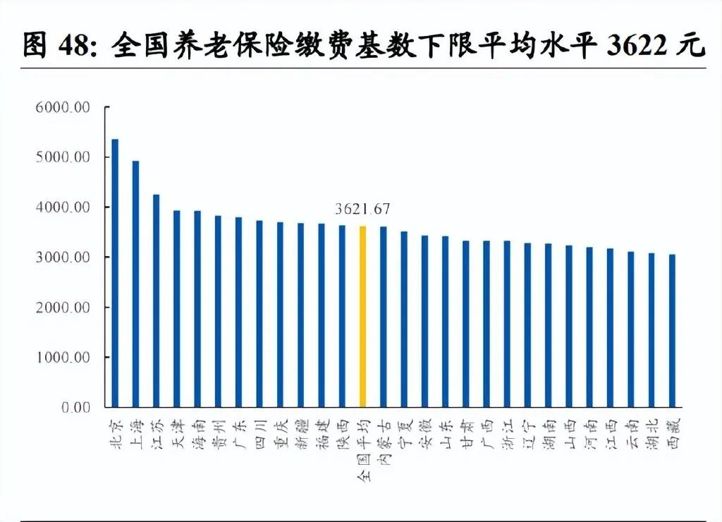 3)繳納比例:16%。2022 年 1 月起,全國(guó)各地將統(tǒng)一執(zhí)行國(guó)家核準(zhǔn)的參保單位和個(gè)人繳費(fèi)比例,調(diào)整后,養(yǎng)老保險(xiǎn)繳費(fèi)統(tǒng)一為:?jiǎn)挝焕U費(fèi)比例為 16%,個(gè)人繳費(fèi)比例 8%。則一年需為按下限繳納的騎手支出的養(yǎng)老保險(xiǎn)為 3,700×16%×12=7,104 元/人,為按實(shí)際收入繳納的騎手支出的養(yǎng)老保險(xiǎn)為 6,300×16%×12=1.20 萬(wàn)元/人,若承擔(dān)比例為 100%,則平臺(tái)全年養(yǎng)老保險(xiǎn)總支出為 7,104 元/人×46.5 萬(wàn)人×41%+1.20 萬(wàn)元/人×46.5 萬(wàn)人×59%=46.82 億元/年。