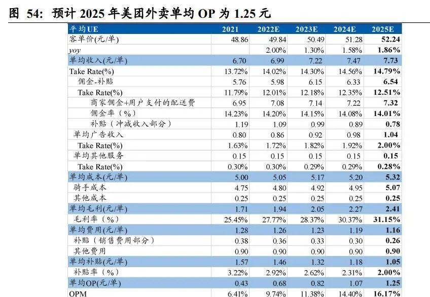 我們以 2021 年美團(tuán)外賣業(yè)務(wù)數(shù)據(jù)為基礎(chǔ),結(jié)合上文定性和定量的分析做出合理假設(shè),測(cè)算 2025 年美團(tuán)外賣的盈利水平。2021-2025 年核心假設(shè):1)美團(tuán)外賣客單價(jià)由 48.86 增長(zhǎng)至 52.24 元;2)廣告營(yíng)銷貨幣化率由 1.63%提升至 2.0%;3)商家傭金率保持不變;4)補(bǔ)貼率由 3.22%降低至 2.00%;5)社保:2022 年職業(yè)傷害險(xiǎn)半落地、2023 年職業(yè)傷害險(xiǎn)半落地+養(yǎng)老保險(xiǎn)半落地、2024 年職業(yè)傷害險(xiǎn)全落地+養(yǎng)老保險(xiǎn)半落地、2025 年職業(yè)傷害險(xiǎn)全落地+養(yǎng)老保險(xiǎn)全落地,2022/2023/2024/2025 年單均騎手成本同比分別+0.05/+0.12/+0.03/+0.12 元/ 單;6)配送成本:考慮疫情影響,假設(shè)配送成本繼續(xù)保持剛性;7)1P 訂單量占比為 67%。測(cè)算得 2025 年美團(tuán)外賣 Take Rate 為 14.79%,單均 OP 為 1.25 元/單,OPM為16.17%,較 2021 年 0.43 元/單的利潤(rùn)水平仍有翻倍空間。