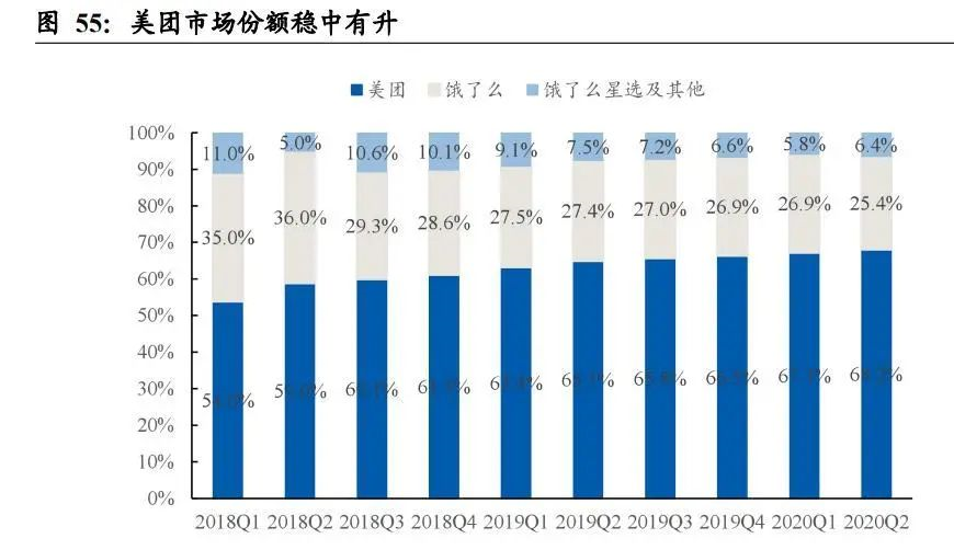 外賣行業(yè)已形成雙寡頭壟斷格局,美團市場份額穩(wěn)中有升。據(jù) Trust data 數(shù)據(jù),2020Q2 美團、餓了么(含餓了么星選)市占率合計超 90%,剩余市場主要由宅急送、麥樂送等自建外賣平臺瓜分。市場份額逐步集中的同時,美團逐漸拉開與競爭對手的差距,市占率穩(wěn)中有升。