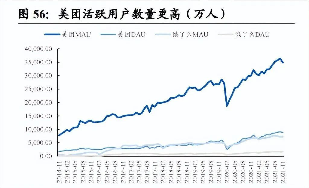 廣覆蓋+技術(shù)&管理賦能,美團商家更多。美團地推在歷次戰(zhàn)役中積累了豐富的地推經(jīng)驗和業(yè)務(wù)拓展能力,在規(guī)模、深度與廣度、執(zhí)行效率、運營能力等均處行業(yè)領(lǐng)先。而餓了么被阿里收購后,包括高管、地推團隊在內(nèi)的成員大換血,在關(guān)鍵時期直接影響了餓了么的地推能力和組織管理能力,被美團拉開差距,商家滲透率相對美團更低。同時,在銷售管理方面美團為商戶提供全業(yè)務(wù)數(shù)據(jù)的接入,幫助商戶基于數(shù)據(jù)的智能化服務(wù),打造以數(shù)據(jù)為基礎(chǔ)的智能化科學決策管理體系,提高商家運營效率;在供應(yīng)鏈方面快驢進貨也給中小商戶提供了支持。商家的豐富度能有效吸引用戶,用戶數(shù)量增加同時又吸引更多商家,進而轉(zhuǎn)動飛輪,美團規(guī)模優(yōu)勢凸顯。據(jù)Quest Mobile 數(shù)據(jù),截至 2021 年 11 月,美團商家 MAU 為 822 萬家,同期餓了么為 606 萬家。