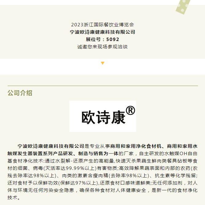 2023展商推介 | 寧波歐詩康健康科技有限公司邀您相約浙江餐博會