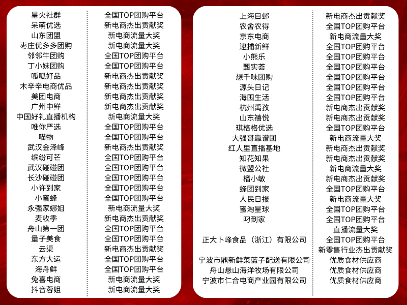 7月23日18:00-20:00,2023浙江國(guó)際餐飲業(yè)博覽會(huì)——招待酒會(huì)暨新零售電商資源晚會(huì)在寧波開(kāi)元名庭大酒店順利舉辦。在晚會(huì)上星火社群、呆萌優(yōu)選、山東團(tuán)盟、棗莊優(yōu)多多團(tuán)購(gòu)、鄰鄰牛團(tuán)購(gòu)等51個(gè)平臺(tái)榮獲“全國(guó)TOP團(tuán)購(gòu)平臺(tái)”、“新電商杰出貢獻(xiàn)獎(jiǎng)”等眾多獎(jiǎng)項(xiàng)。