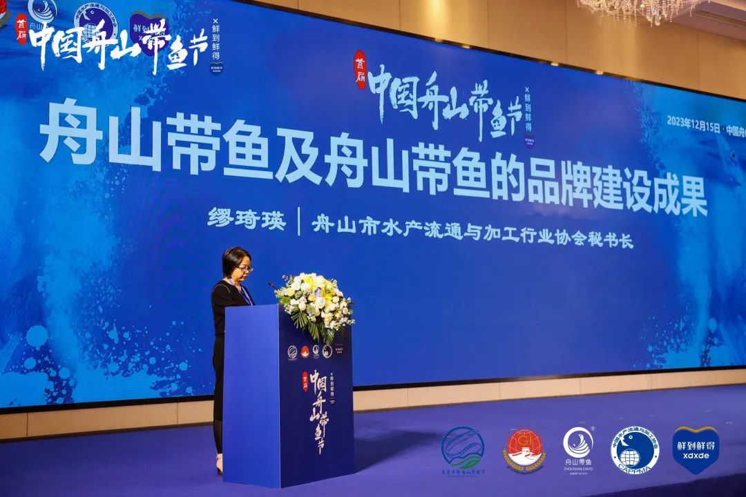舟山市水產(chǎn)流通與加工行業(yè)協(xié)會(huì)繆琦瑛秘書長(zhǎng)向大家展示了舟山帶魚及舟山帶魚品牌建設(shè)成果。