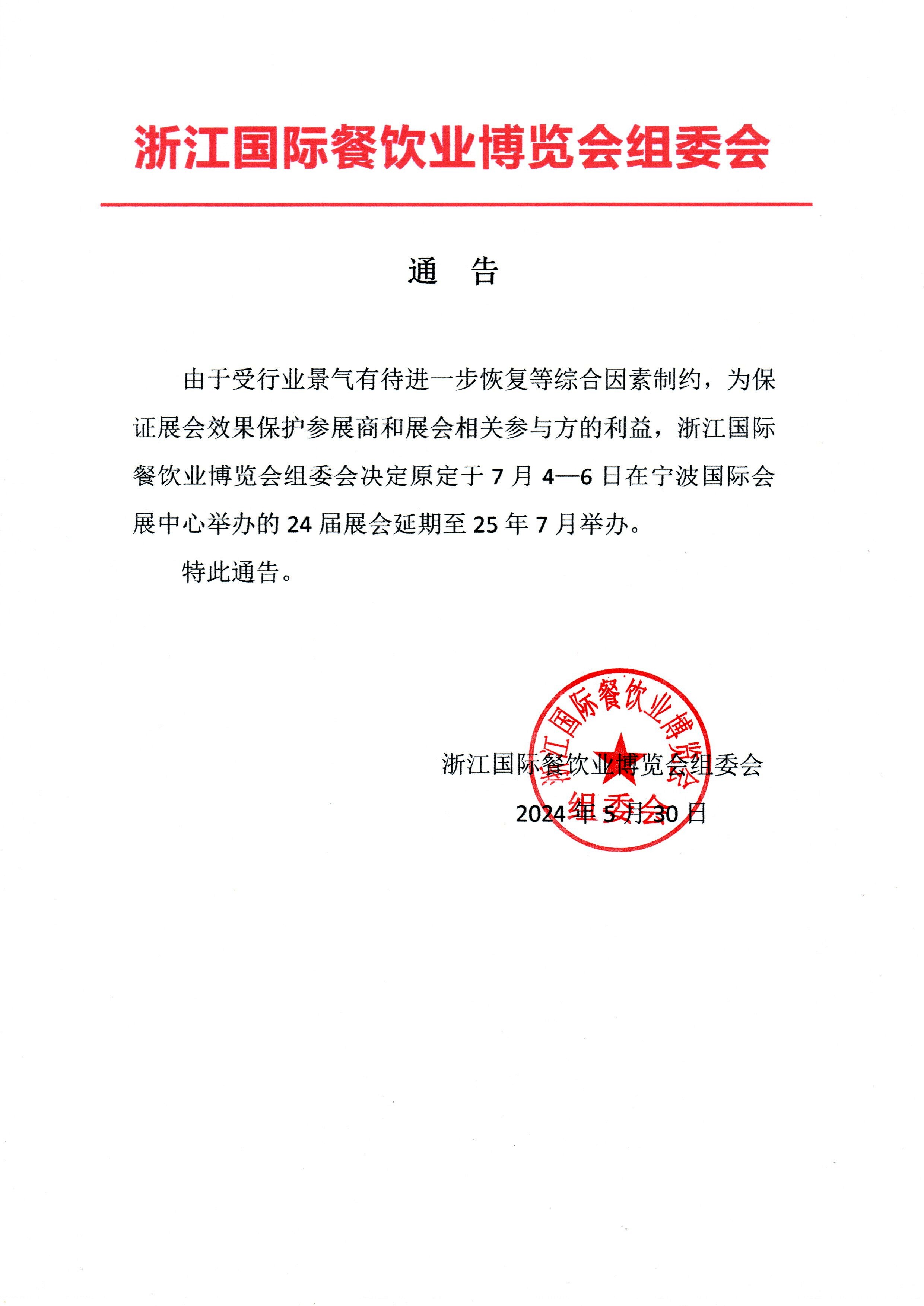 鑒于行業(yè)景氣有待進(jìn)一步恢復(fù)等綜合因素制約,為保證展會效果、保護(hù)參展商和展會相關(guān)參與方的利益,經(jīng)與各支持單位、合作伙伴共同商議,浙江國際餐飲業(yè)博覽會組委會決定將原定于7月4-6日在寧波國際會展中心舉辦的 24 屆展會延期至 25年7月舉辦。